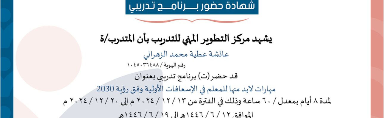 الأستاذة عائشة عطية الزهراني حاصلة على درجة البكالوريوس في الجغرافيا من جامعة الرياض ( الأميرة نورة حالياً) ( كلية التربية) عام 1428هـ/2009م. تمتلك خبرة تدريسية امتدت من عام 1440هـ وحتى 1445هـ . تتمتع بمهارات متنوعة تشمل التدريس، التخطيط، إدارة الوقت والفصل، استخدام التقنيات الحديثة، الإبداع والابتكار، والقدرة على العمل ضمن فريق. للتواصل.